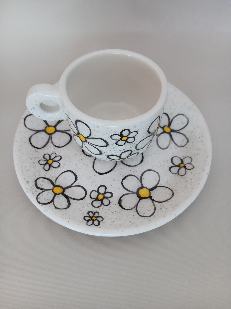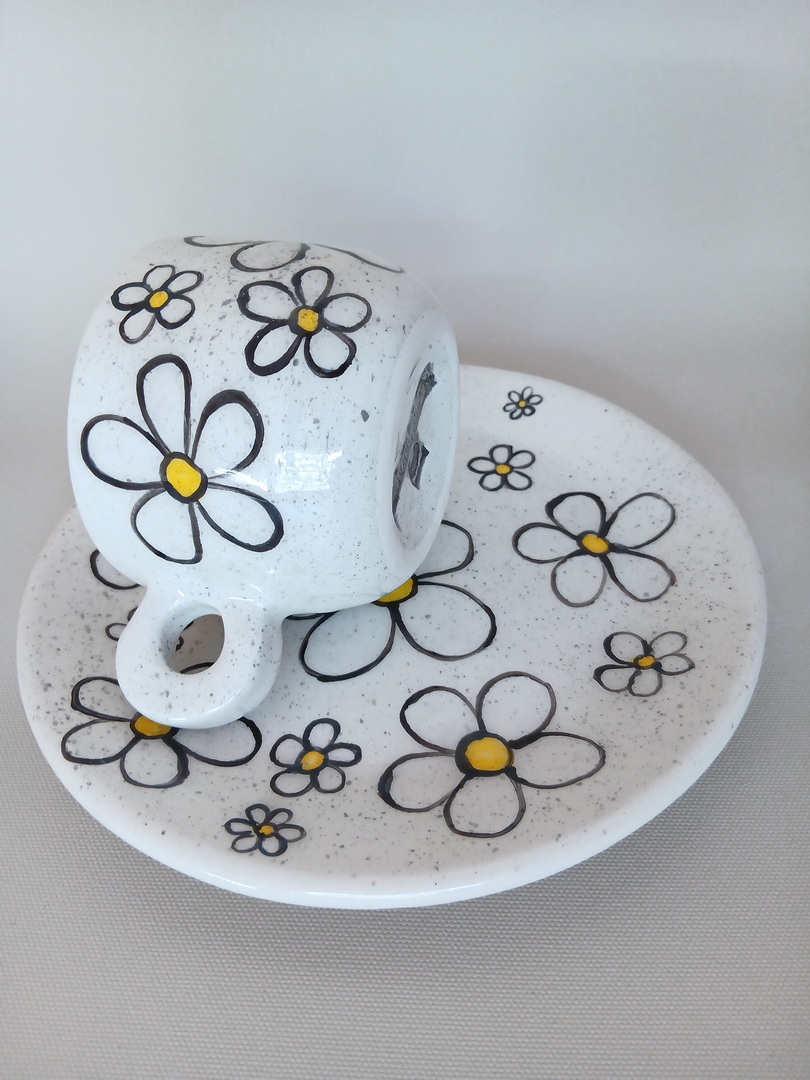 Κεραμική κούπα με πιάτο, λευκές μαργαρίτες